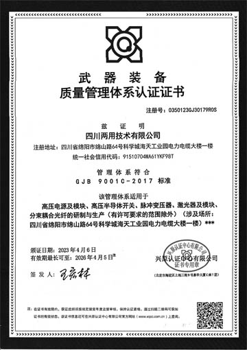 公司通過(guò)對(duì)多條生產(chǎn)線開(kāi)展了改造升級(jí)、深化“高能工兵連、軍工代工線”理念、落實(shí)高可靠質(zhì)量責(zé)任意識(shí)、降低高風(fēng)險(xiǎn)作業(yè)安全舉措、培訓(xùn)全員保密應(yīng)知應(yīng)會(huì)等,使得公司具備了良好的生產(chǎn)與代工條件,公司通過(guò)唯一具有核工業(yè)背景和認(rèn)證資格的權(quán)威第三方認(rèn)證機(jī)構(gòu)評(píng)審,順利取得了武器裝備質(zhì)量管理體系認(rèn)證,管理體系符合GJB9001C-2017標(biāo)準(zhǔn),可開(kāi)展高可靠質(zhì)量等級(jí)的高壓電源及模塊、高壓半導(dǎo)體開(kāi)關(guān)、脈沖變壓器、激光及模塊、分束耦合光纖的研制與生產(chǎn),同時(shí)可開(kāi)展軍工級(jí)的高壓與激光儀器領(lǐng)域的代工。